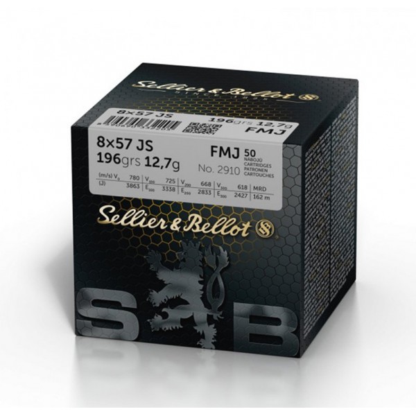 Náboje 8×57 JS od Sellier Bellot, střela FMJ 196gr. (12,7g), mosazná nábojnice, zápalka boxer. Baleno po 50ks.